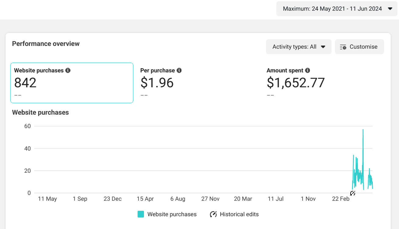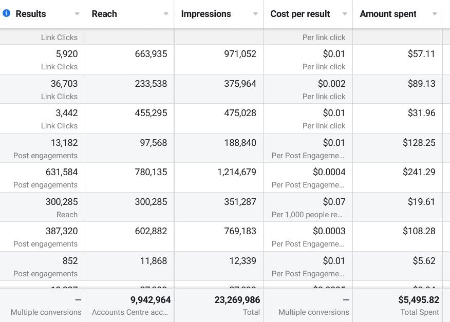 Delivered 842 direct website purchases and 15k+ leads, maintaining extreme budget efficiency across 23 million total impressions.